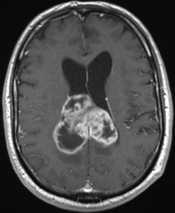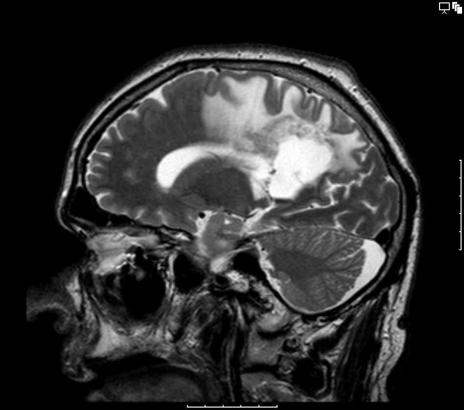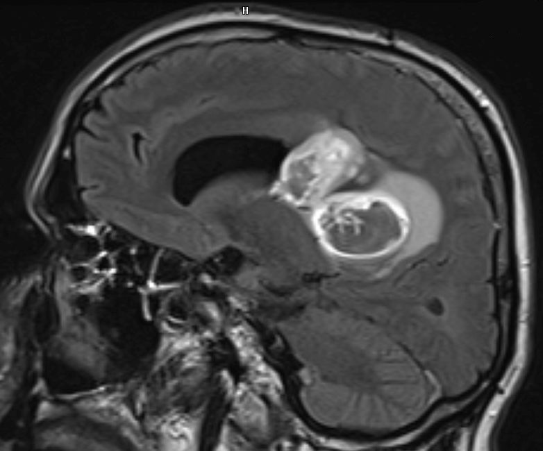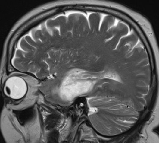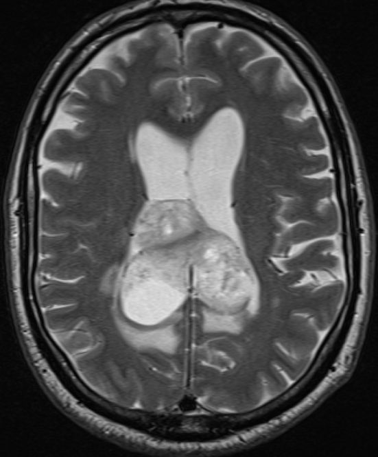 62-jähriger Mann mit torkeligem Gang, Amnesie und Verwirrtheit. Schmetterlingsgliom des hinteren Balkens.![]() |