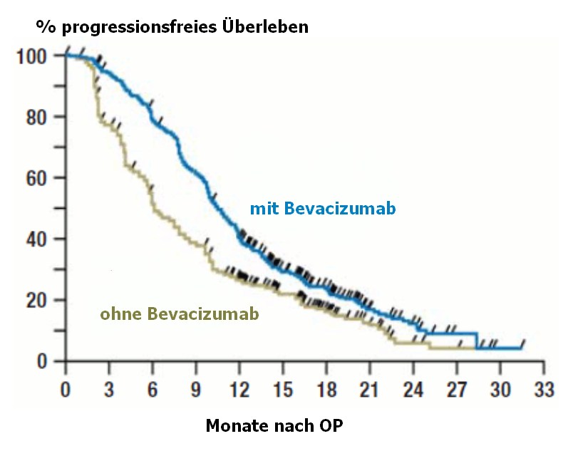 | Ergebnis | Mit Bevacizumab war das progressionsfreie Überleben besser, das Gesamtüberleben ist aber gleich - bei stärkeren Nebenwirkungen. | ||||||||||||||||||||||||||||||||||